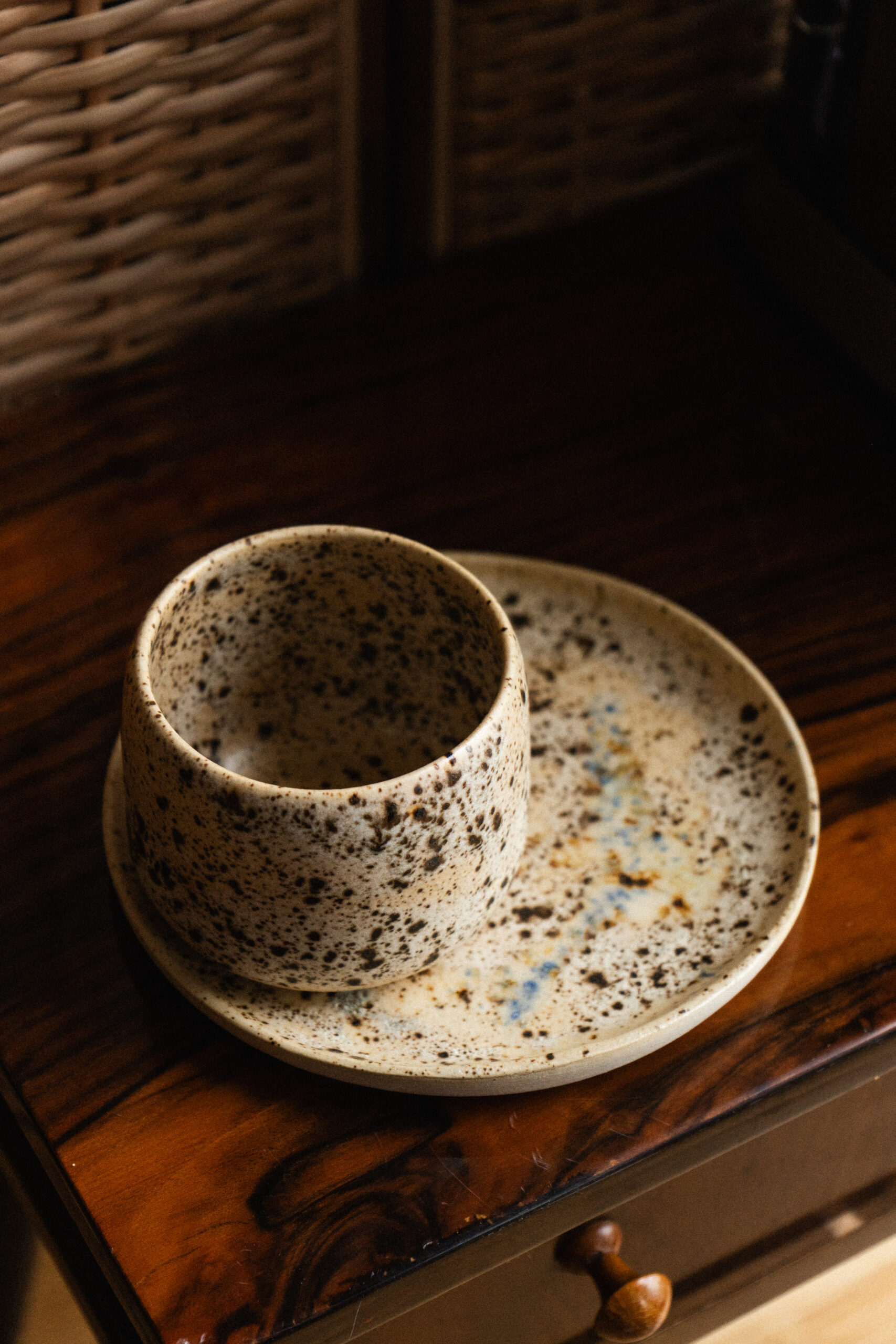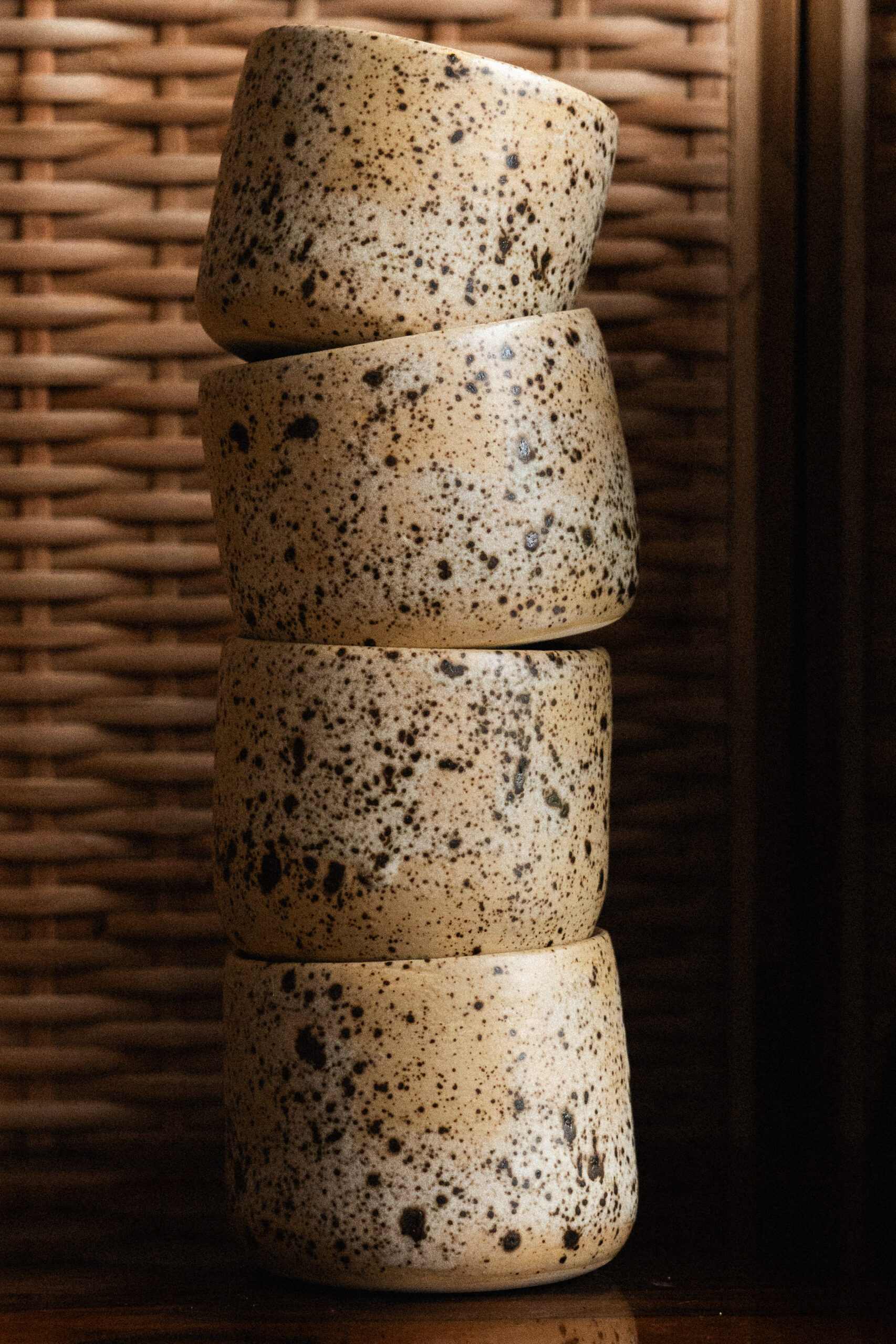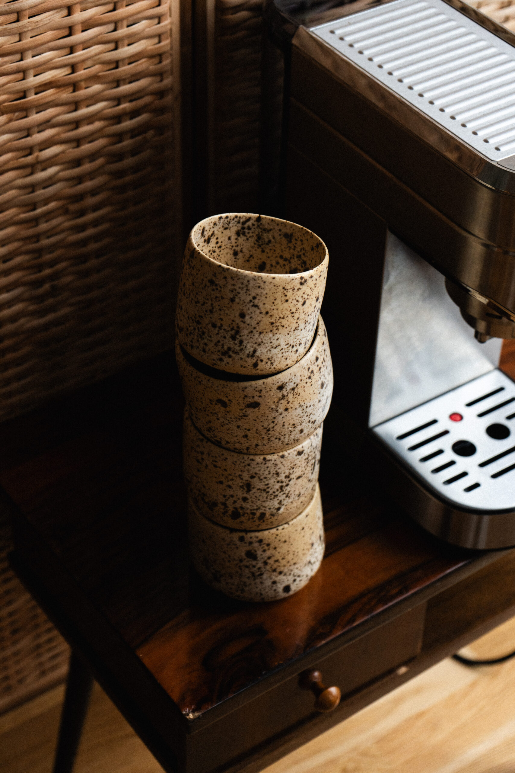 Te czarki, tworzone w całości ręcznie, niosą w sobie zarówno surową naturalność i precyzję rzemiosła. Każda z nich jest jedynym w swoim rodzaju małym dziełem sztuki – ozdobiona niepowtarzalnym układem plamek szkliwa, które czynią z codziennego rytuału picia kawy czy herbaty doświadczenie pełniejsze, głębsze i bardziej osobiste. Przeznaczone do kontaktu z żywnością oraz wodą.