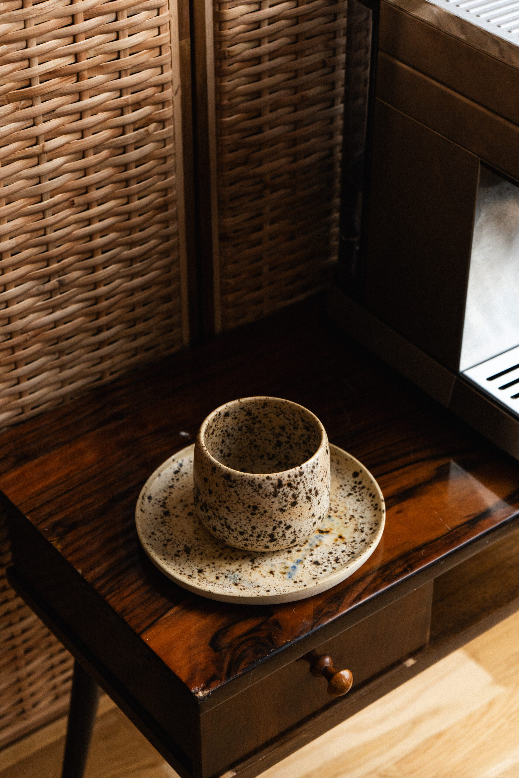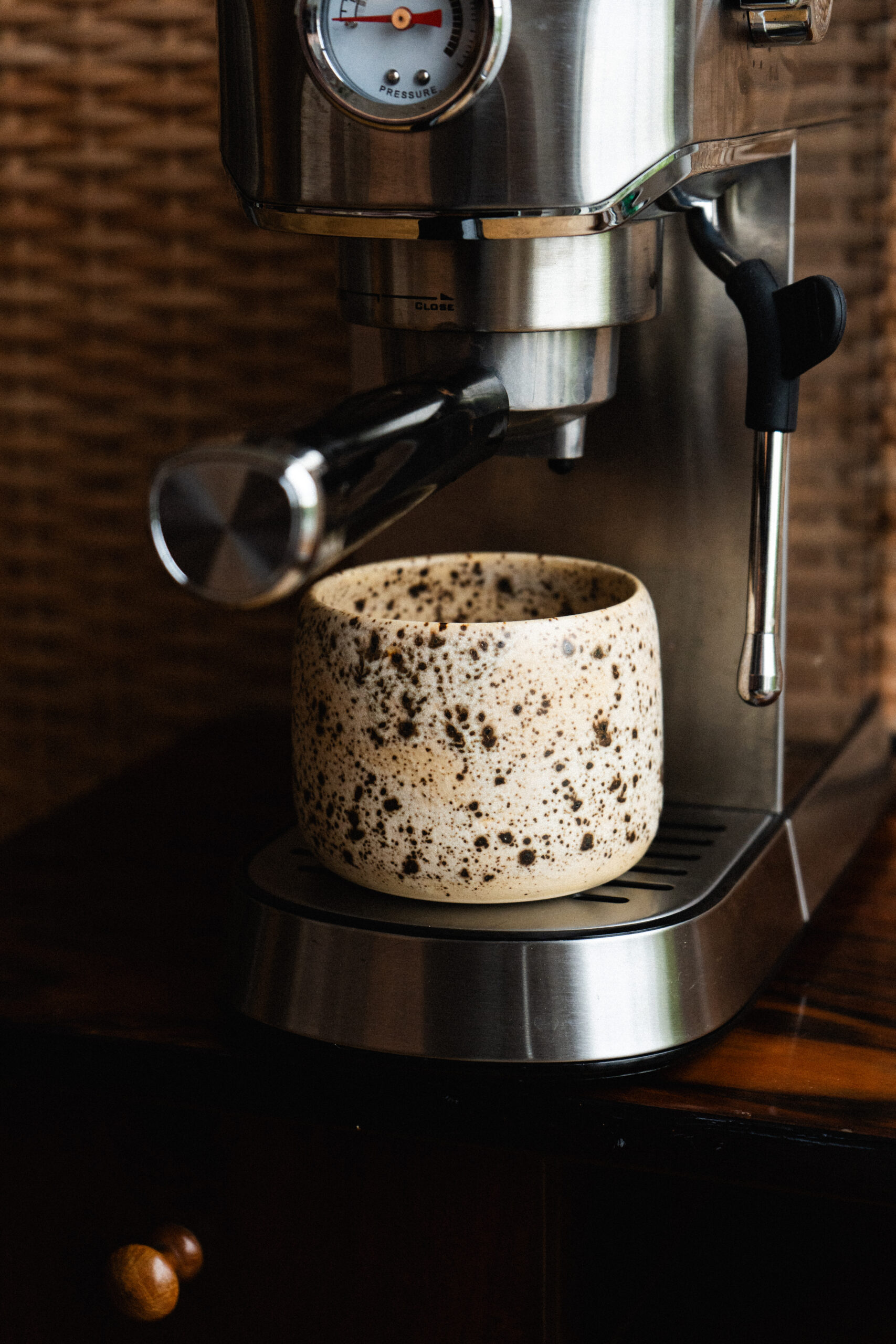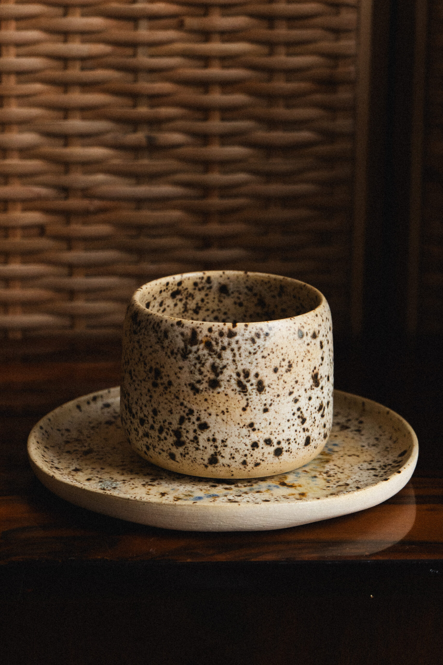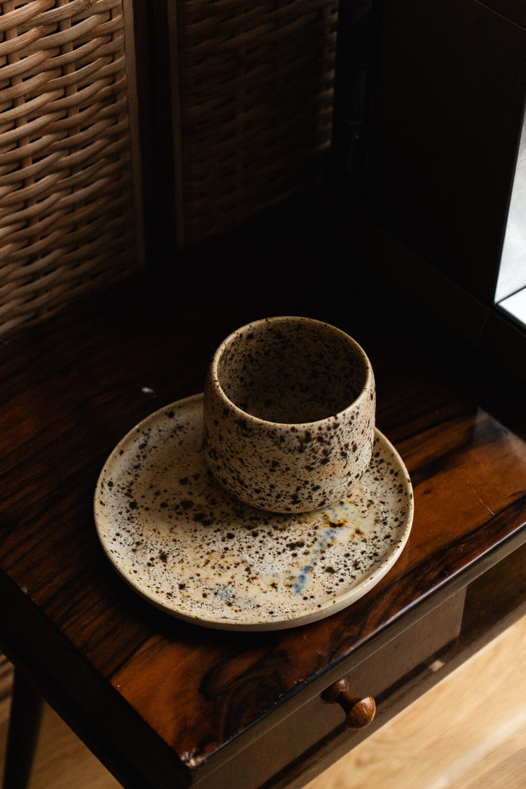 Te czarki, tworzone w całości ręcznie, niosą w sobie zarówno surową naturalność i precyzję rzemiosła. Każda z nich jest jedynym w swoim rodzaju małym dziełem sztuki – ozdobiona niepowtarzalnym układem plamek szkliwa, które czynią z codziennego rytuału picia kawy czy herbaty doświadczenie pełniejsze, głębsze i bardziej osobiste. Przeznaczone do kontaktu z żywnością oraz wodą.