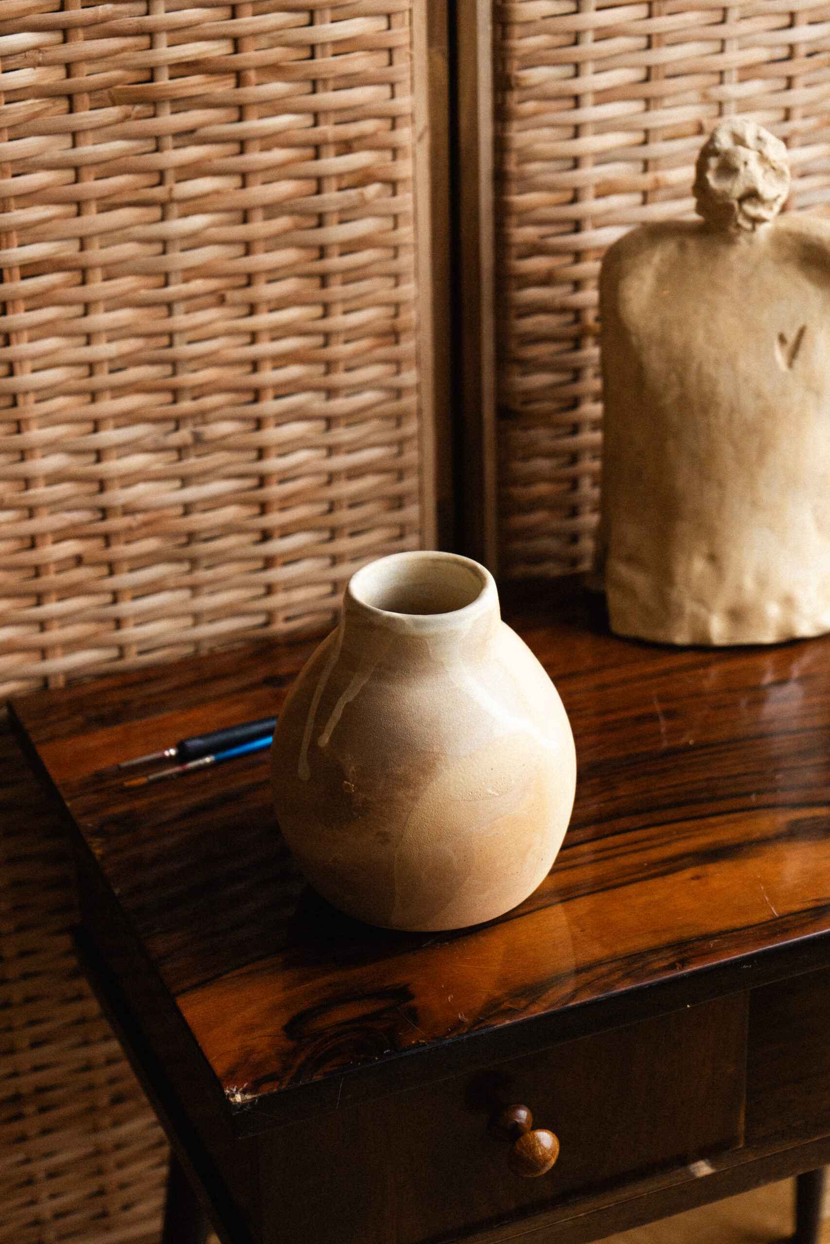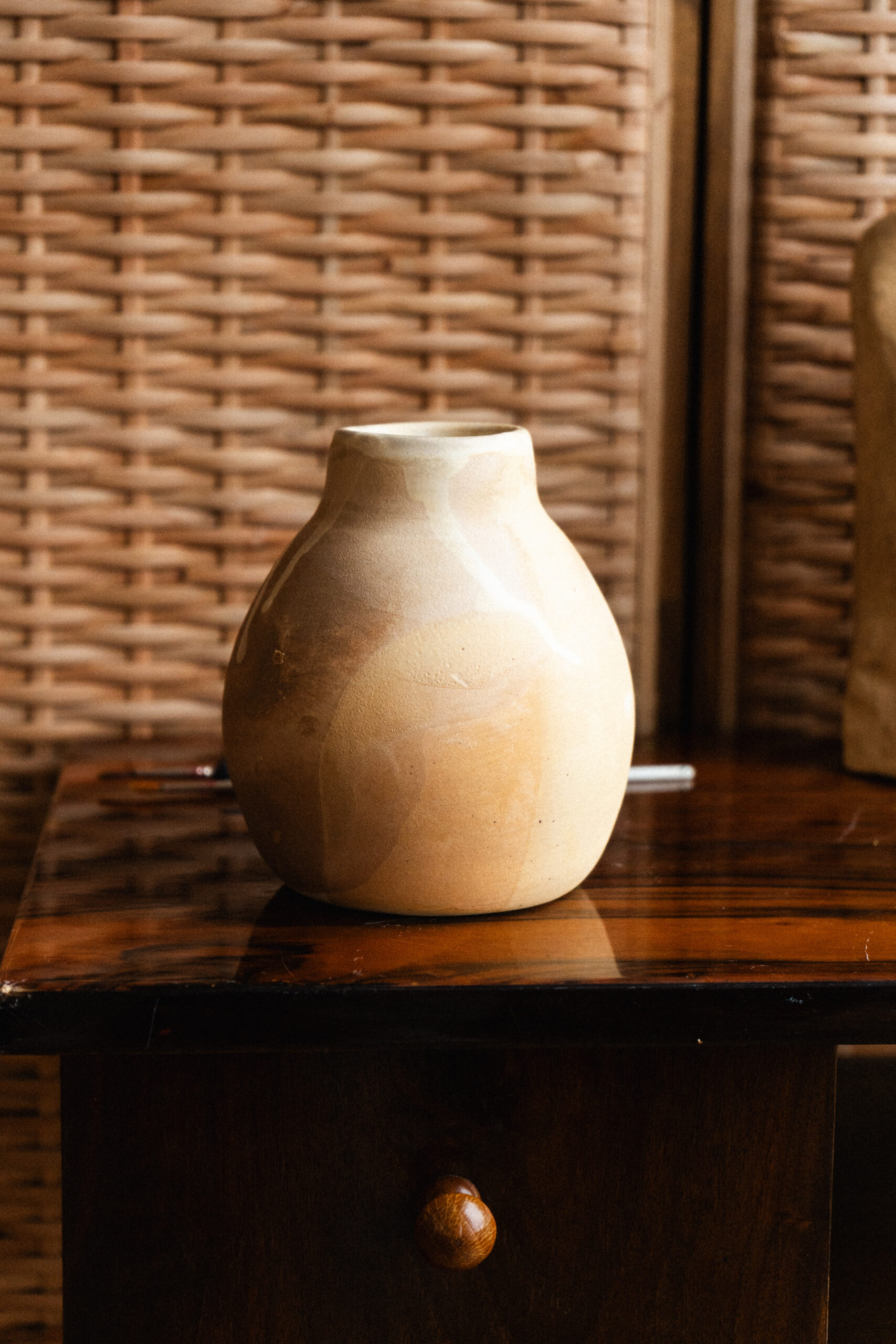 Ten ręcznie wykonany wazon to prawdziwe dzieło sztuki, które łączy naturalną teksturę z subtelną elegancją. Każdy szczegół, ręcznie rzeźbiony, tworzy unikalny wzór, który nadaje charakter każdemu wnętrzu, podkreślając piękno gliny i prawdziwą pracę rzemieślniczą. Przeznaczony na suche kompozycje kwiatowe.