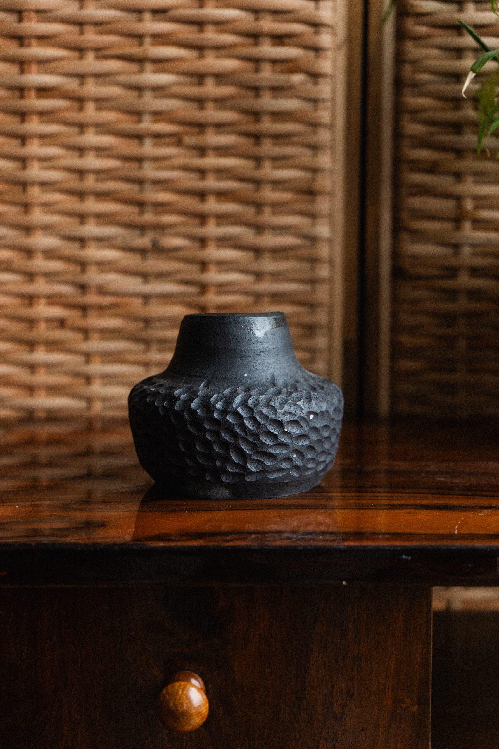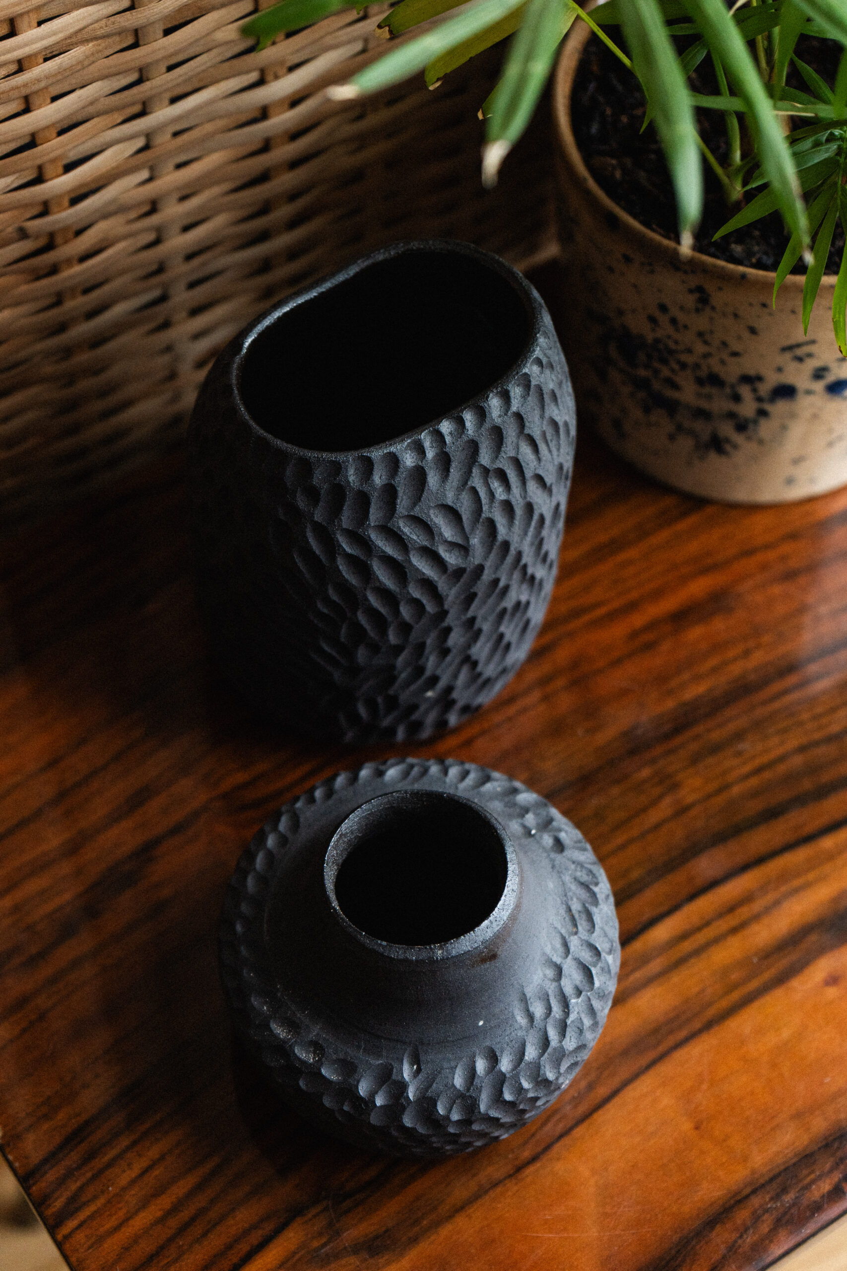 To surowy ręcznie wytoczony na kole garncarskim wazon, charakteryzujący się rzeźbioną ręcznie strukturą. Wykonany z ciemnej gliny z delikatnym szamotem, dzięki czemu cała forma legitymuje się elegancją jednocześnie pozostając w prostej linii skromności. Ta oszczędna forma wyróżni się w minimalistycznych wnętrzach oraz obroni się jako element całości jednocześnie pozostając charakterystycznym punktem przestrzeni. Wazon może być zalewany wodą.