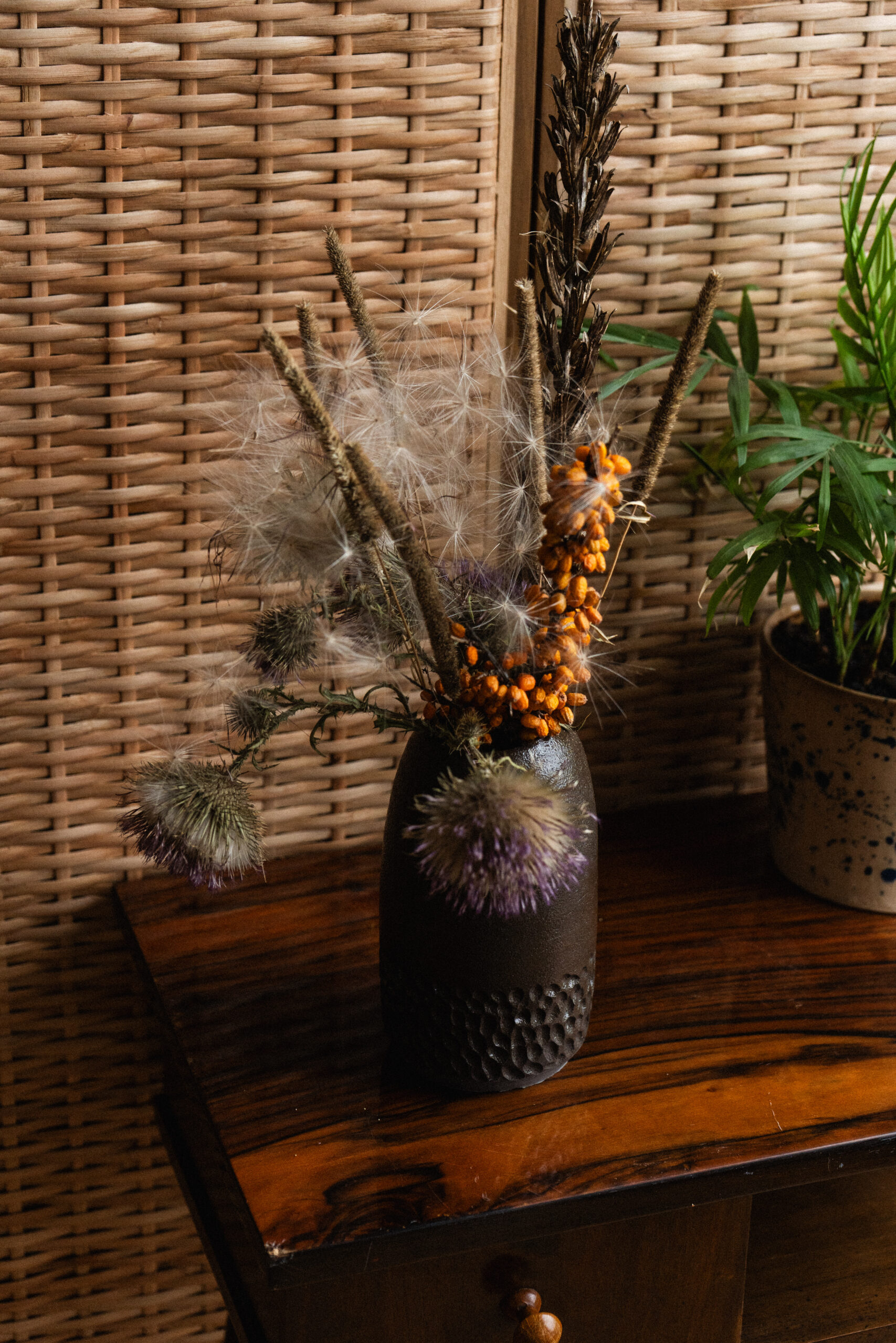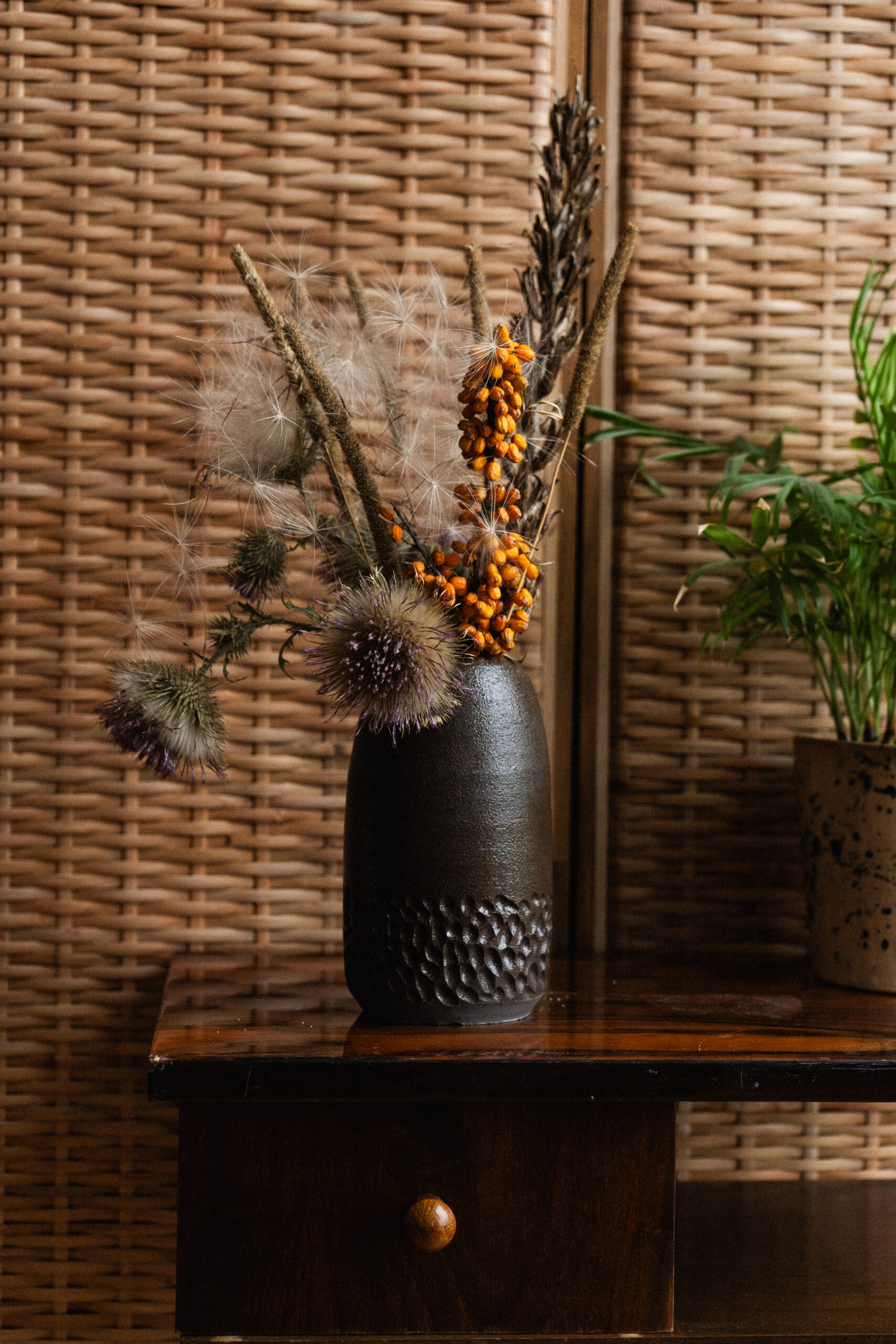 To surowy ręcznie wytoczony na kole garncarskim wazon, charakteryzujący się rzeźbioną ręcznie strukturą. Wykonany z ciemnej gliny z delikatnym szamotem, dzięki czemu cała forma legitymuje się elegancją jednocześnie pozostając w prostej linii skromności. Ta oszczędna forma wyróżni się w minimalistycznych wnętrzach oraz obroni się jako element całości jednocześnie pozostając charakterystycznym punktem przestrzeni. Wazon może być zalewany wodą.