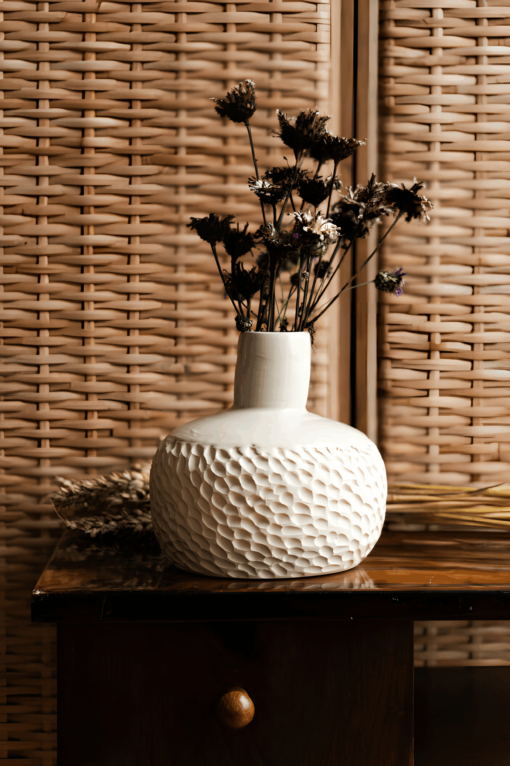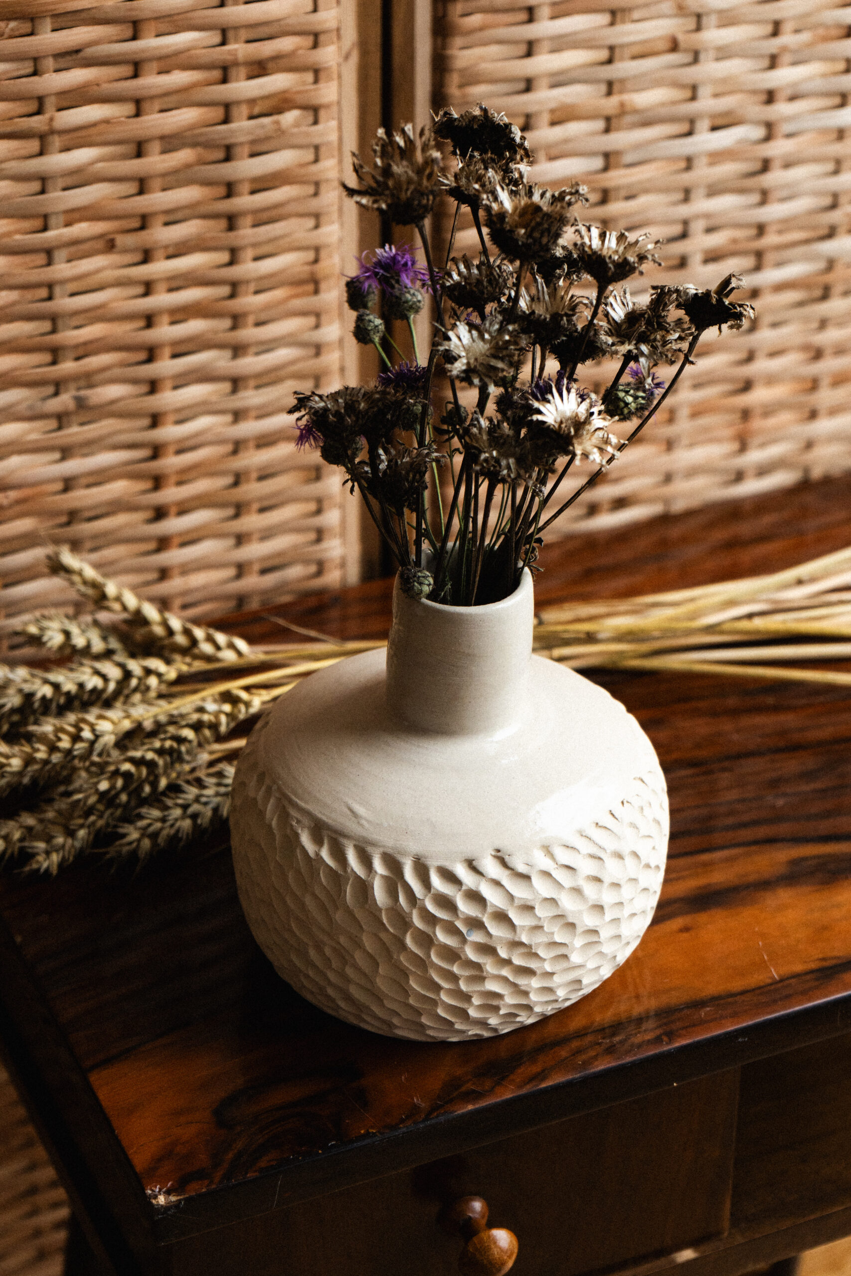Ten bezkompromisowy wazon to połączenie nowoczesnego designu i ponadczasowej elegancji. Ręcznie wykonany i rzeźbiony z gliny, stanowi unikalny akcent, który przyciąga wzrok i dodaje charakteru każdemu wnętrzu.