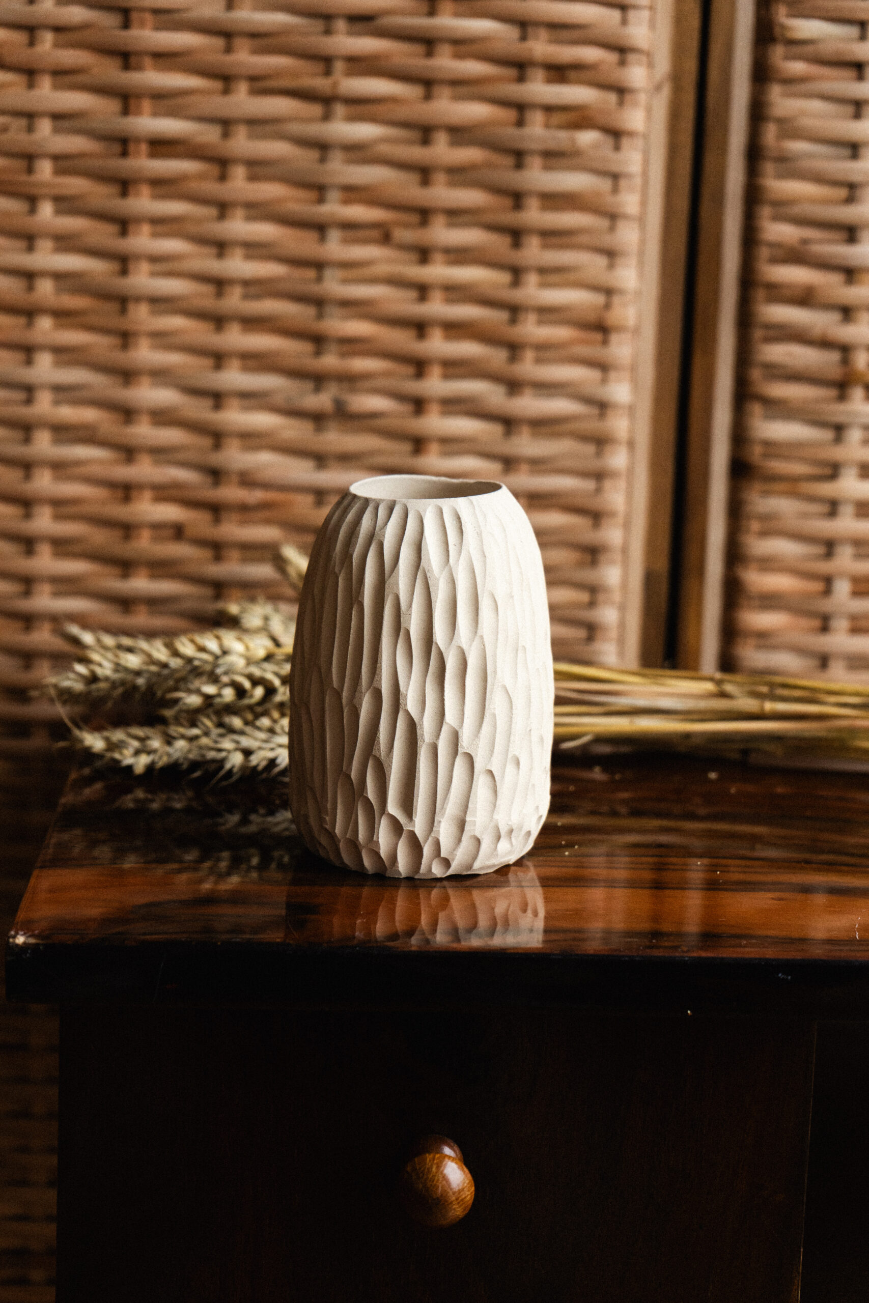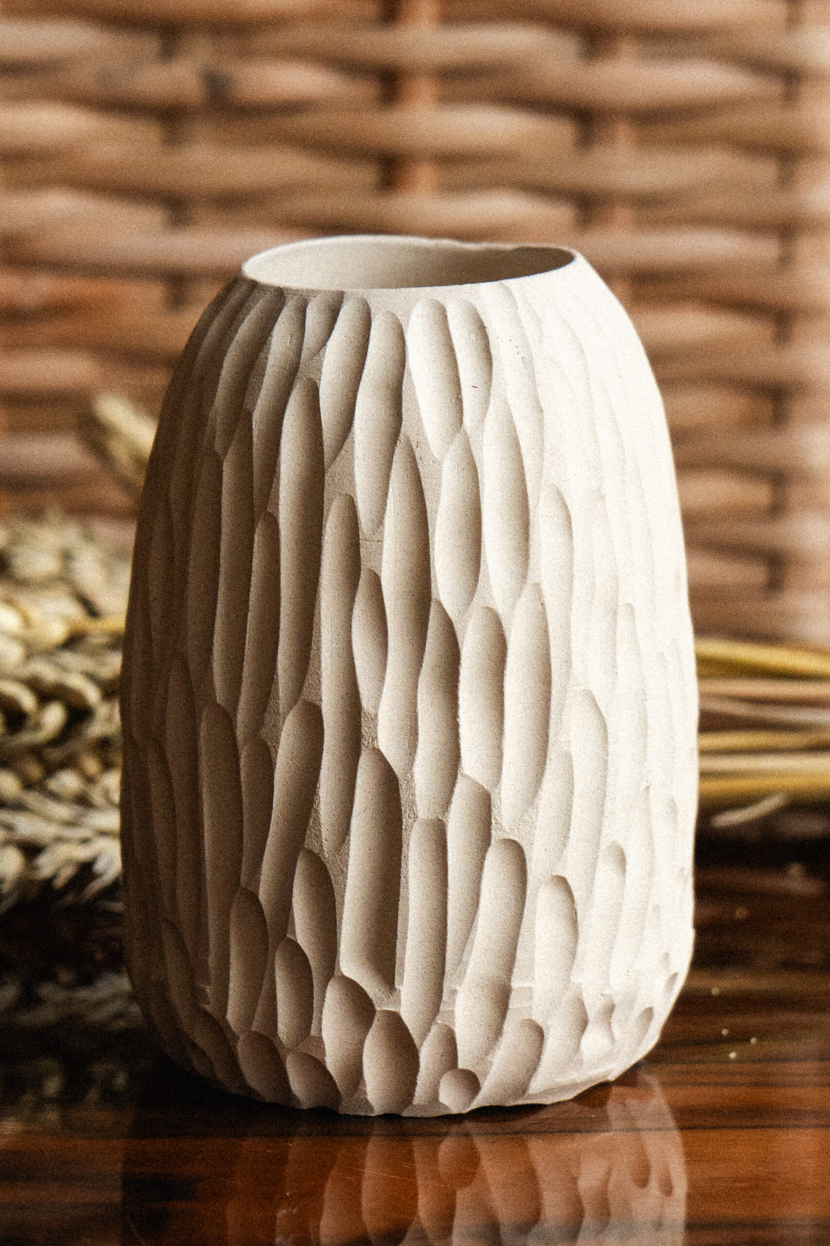 Ten ręcznie wykonany wazon to prawdziwe dzieło sztuki, które łączy naturalną teksturę z subtelną elegancją. Każdy szczegół, ręcznie rzeźbiony, tworzy unikalny wzór, który nadaje charakter każdemu wnętrzu, podkreślając piękno gliny i prawdziwą pracę rzemieślniczą. Wazon może być zalewany wodą.