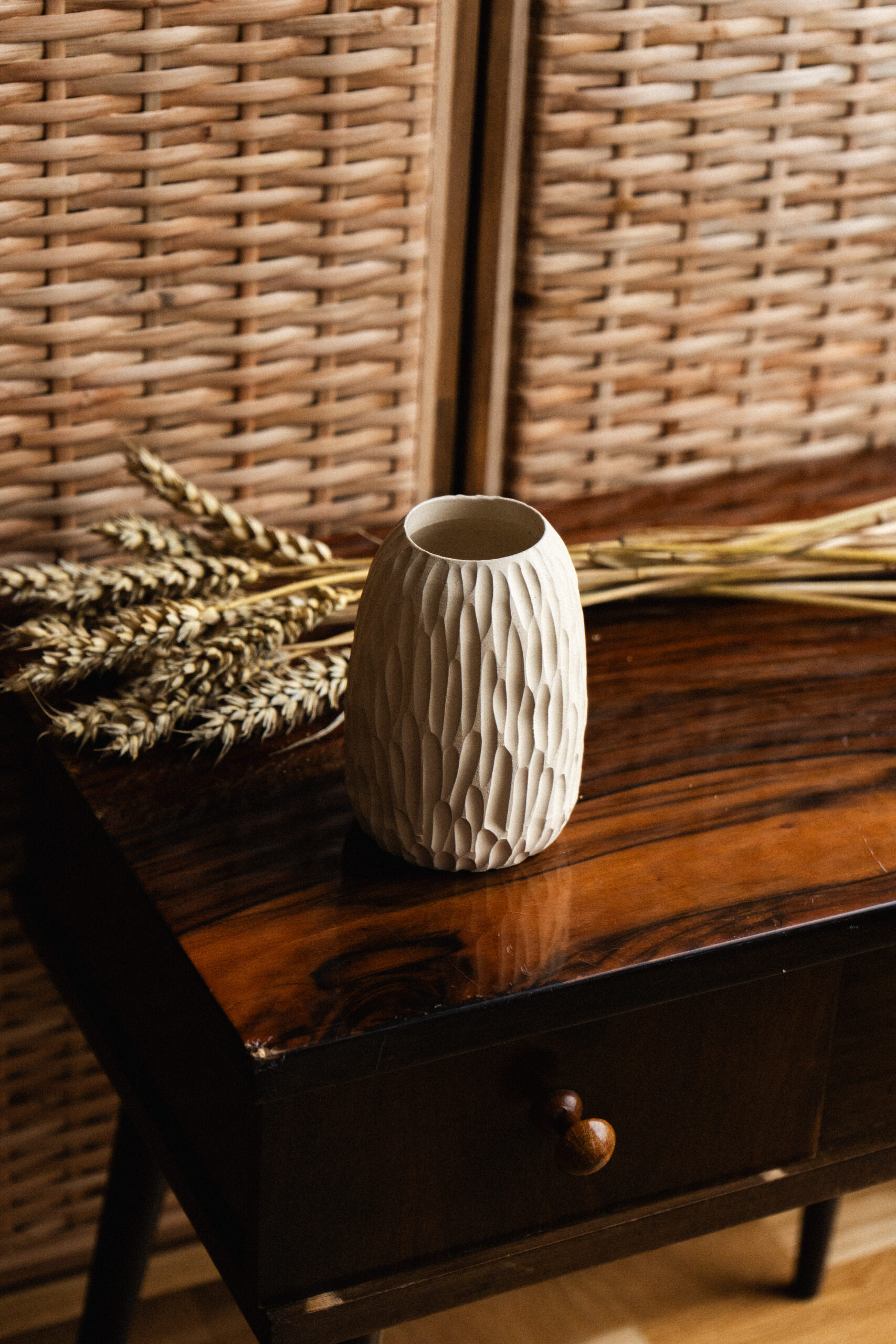Ten bezkompromisowy wazon to połączenie nowoczesnego designu i ponadczasowej elegancji. Ręcznie wykonany i rzeźbiony z gliny, stanowi unikalny akcent, który przyciąga wzrok i dodaje charakteru każdemu wnętrzu.