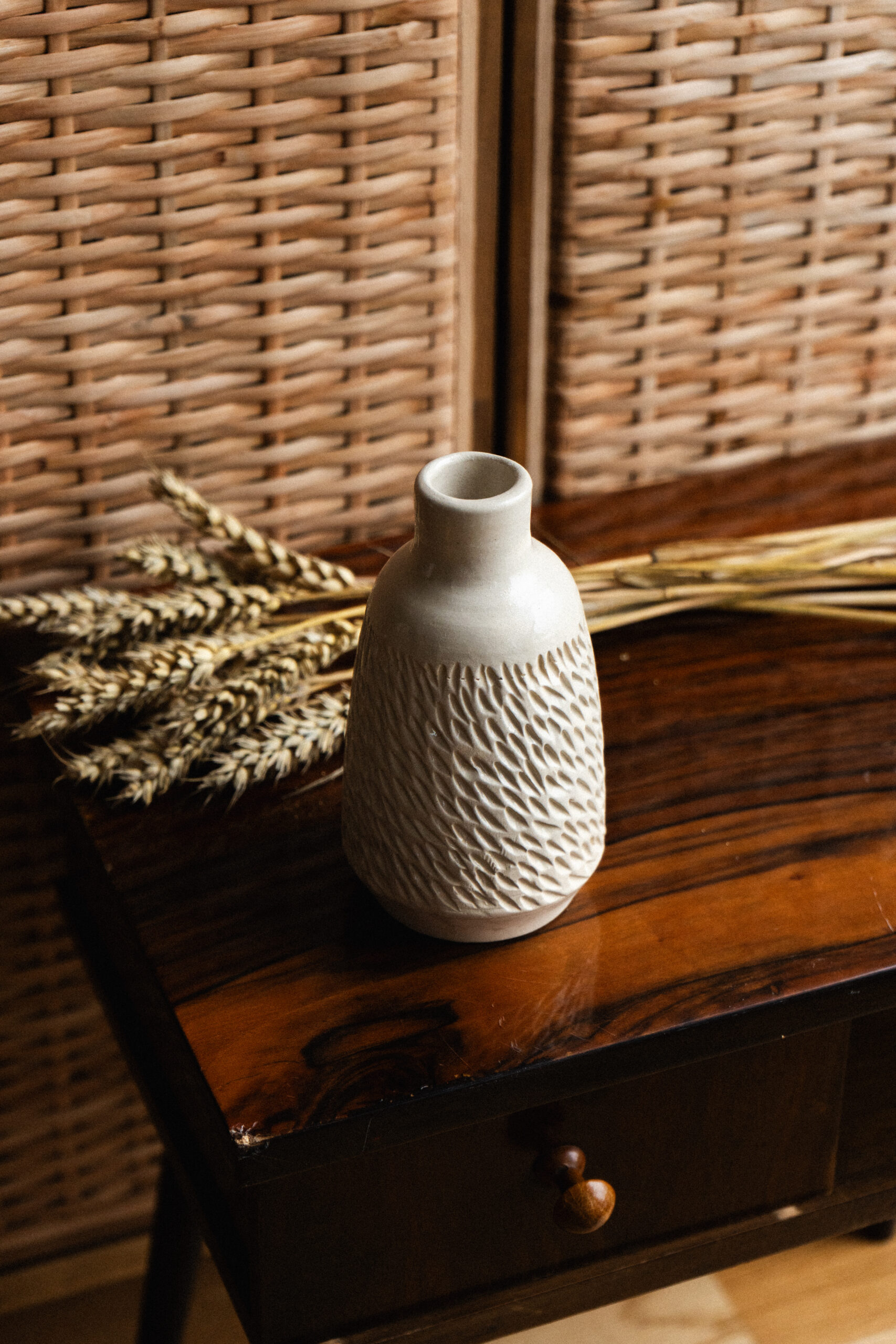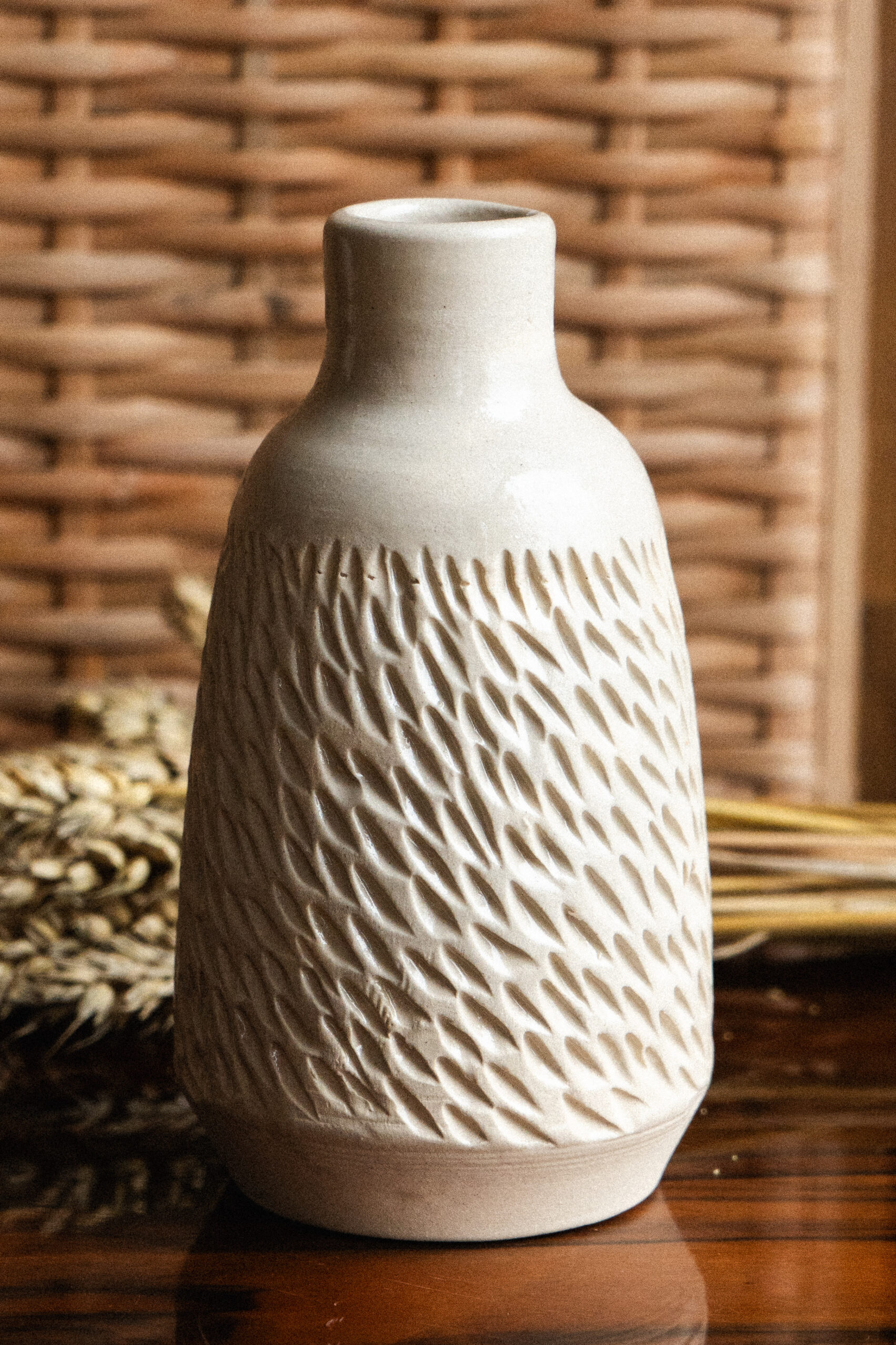Ten ręcznie wykonany wazon to prawdziwe dzieło sztuki, które łączy naturalną teksturę z subtelną elegancją. Każdy szczegół, ręcznie rzeźbiony, tworzy unikalny wzór, który nadaje charakter każdemu wnętrzu, podkreślając piękno gliny i prawdziwą pracę rzemieślniczą. Wazon może być zalewany wodą.